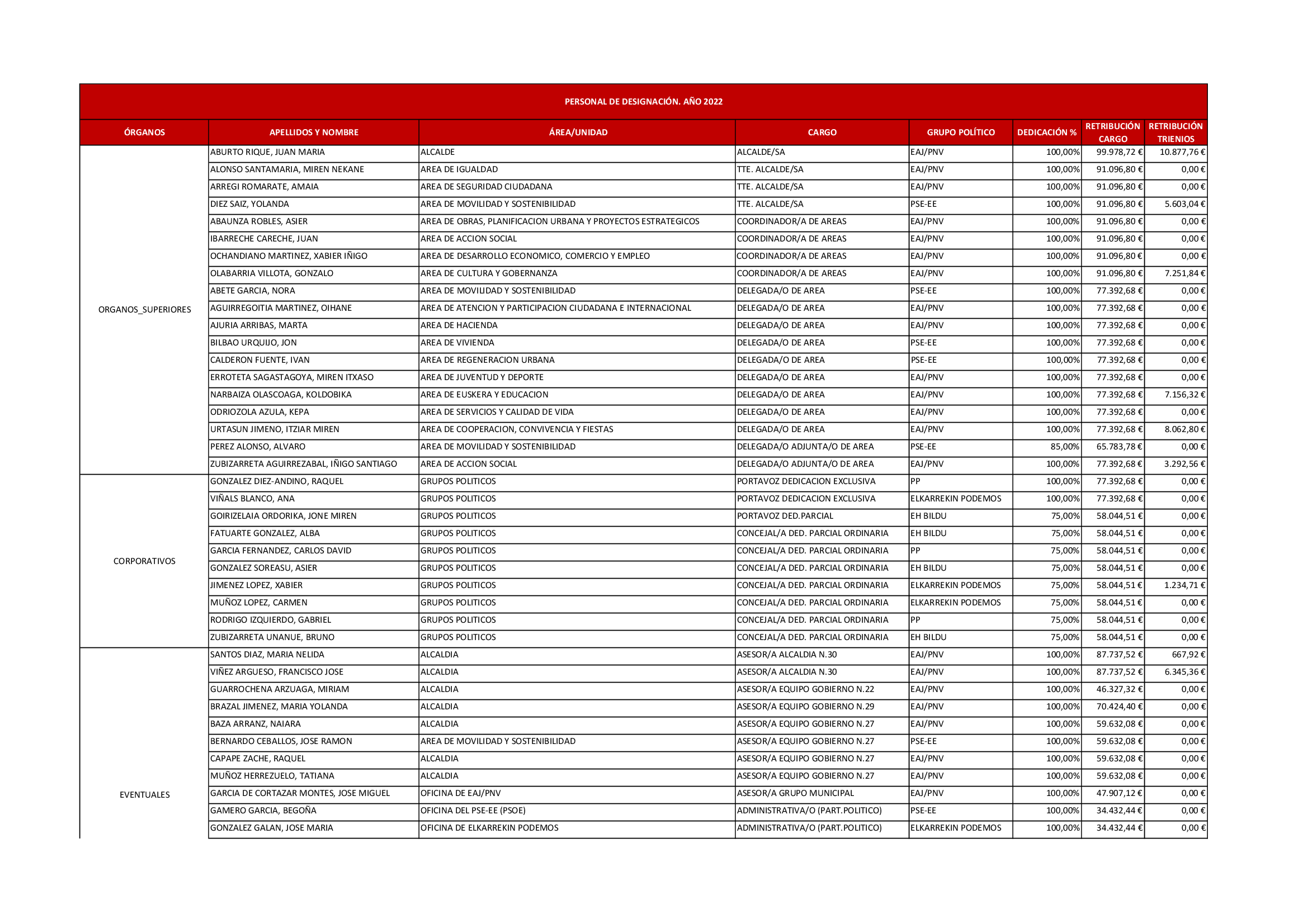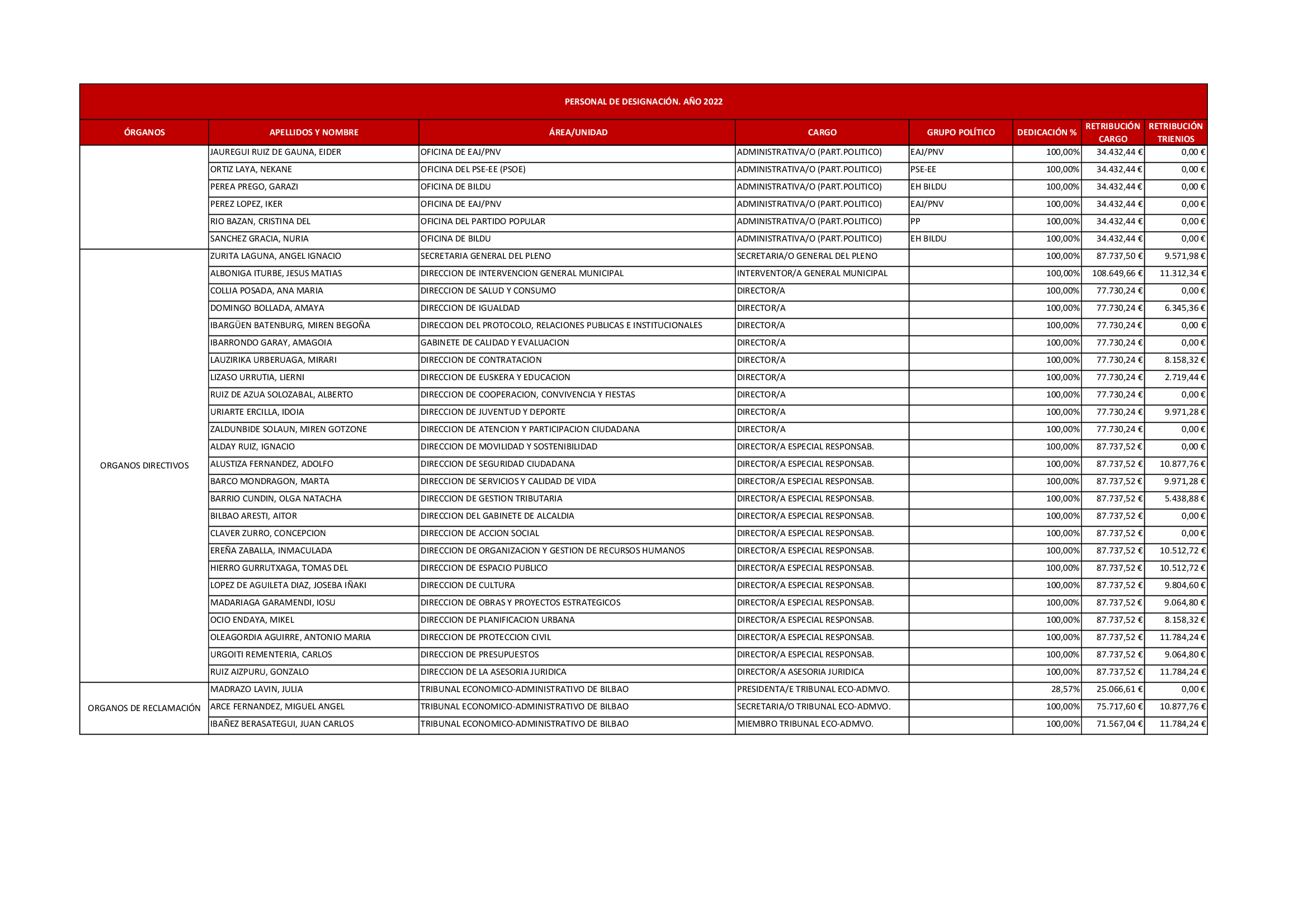 Hay cargos en el ayuntamiento que cobran en los organos superiores,casi 100,000 euros al igual que en los organos corporativos,eventuales,directivos o de reclamacion y casi todos estan asociados al PNV-EAJ, escepto en organo directivo o de reclamacion que hay cargos que no tienen asociado ningun partido politico